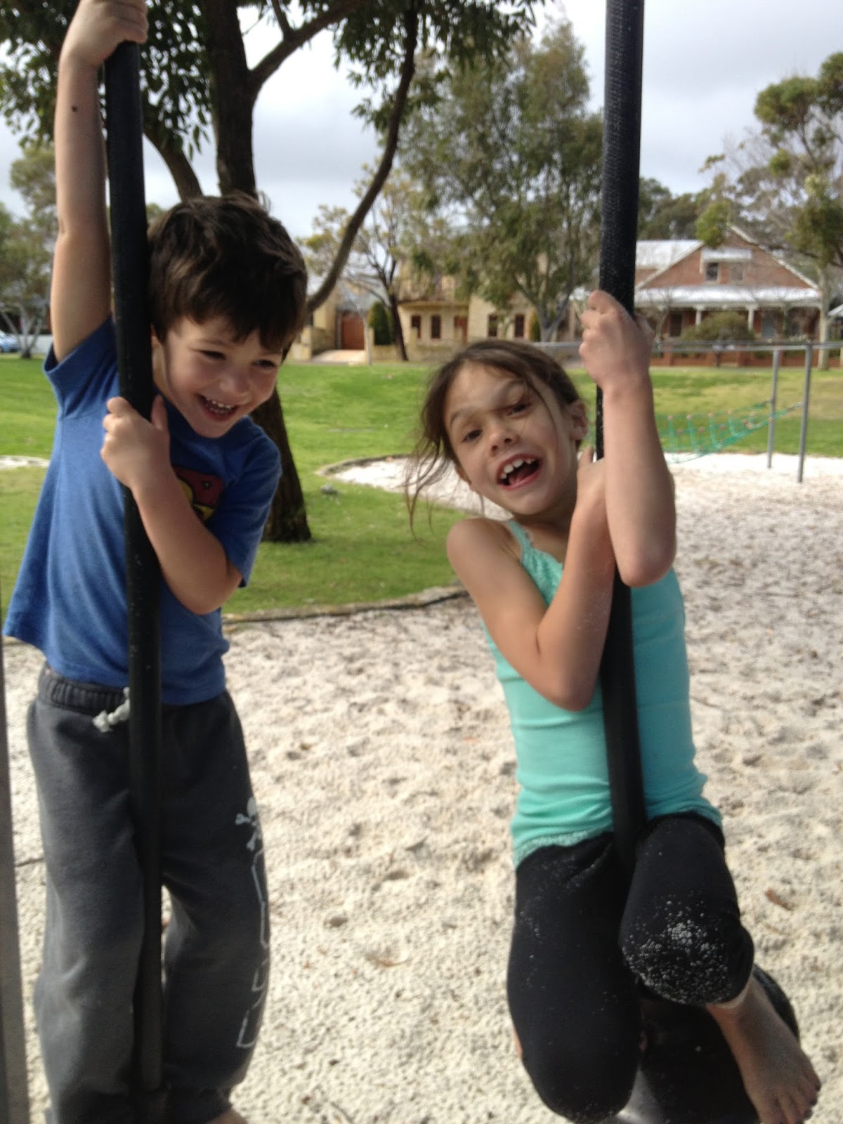We set off down the hill as instructed and were thrilled to come across the Fremantle Arts Centre that had a bunch of kids Gia's age milling about. Turns out every Wednesday at 9:30am they have the 'Fun Bus' come to the Art Centre and set up mats all about the grounds with different activity centers. Quite a social hour for the 'mum's' too.