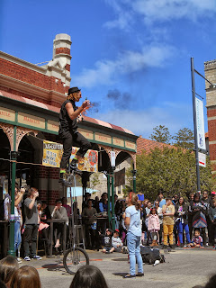Seeing as how we are on school holiday, each of the kids gets a day to be in charge and plan the day. Embracing the birthday holiday sham, we headed into Freo right afterwards to visit the Fremantle Markets (which are usually not open on Mondays). And Monday is Gia's day to be the "Little Girl In Charge" :) Her plan with the markets was to get a picnic lunch to take to the Esplanade play set. So we did just that, stopping to enjoy street performers on the way.