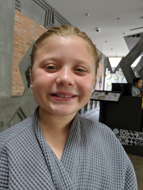 Once back, Lily and Caden headed in for their first-ever facial while Corey, Gia and I enjoyed the pool and waited our turn. We also ordered some milk for the stray kittens :)